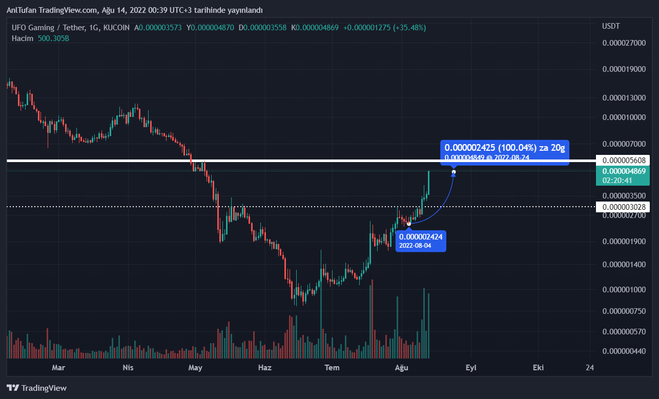 Bu hafta itibariyle yüzde 100’e yakın bir yükseliş yaşayan UFO, birçok kritik direnç noktasını aşarak 0.000004802 dolar direnç seviyesine kadar yükseldi.