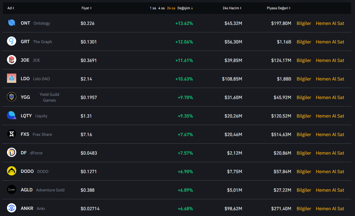 Binance tüm dünyada en fazla kullanıcıya sahip borsa olsa da, Türkiye’de bu oranın genel ortalamaya göre daha yüksek olduğu görülüyor. Binance’deki altcoin’lerin hareketlerini incelediğimizde, bugün özelinde sadece 4 ürünün yüzde 10’dan fazla yükseliş yaşadığı gözlenmekte.