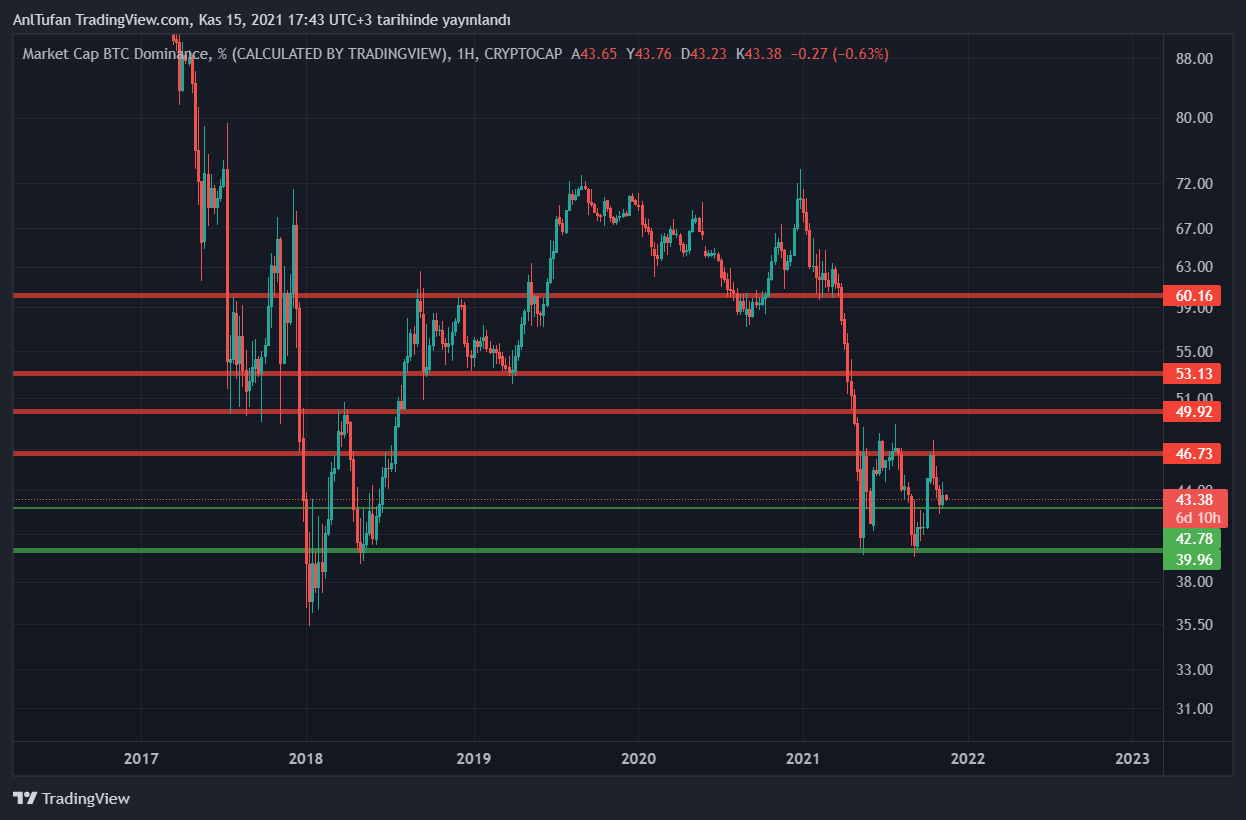 Üzerinde bulunan ilk direnç seviye olan %46nın üstüne çıkması durumunda altcoinlerde geri çekilmeler görebileceğimiz gibi Bitcoin fiyatının artışına da şahit olabiliriz.
