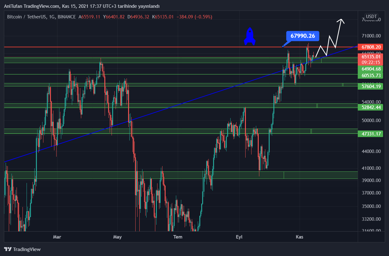 67.900 dolar da bulunan direnç seviyesinin hala üstüne çıkmayı başaramayan Bitcoin, yeni yatırımcı girişi için uygun bir alım seviyesinde. Yükselen bir trend çizgisi bulunan BTC’de, aşağıda ki grafikte de belirttiğimiz gibi bir yükseliş hareketi yapması olası gözükmekte.