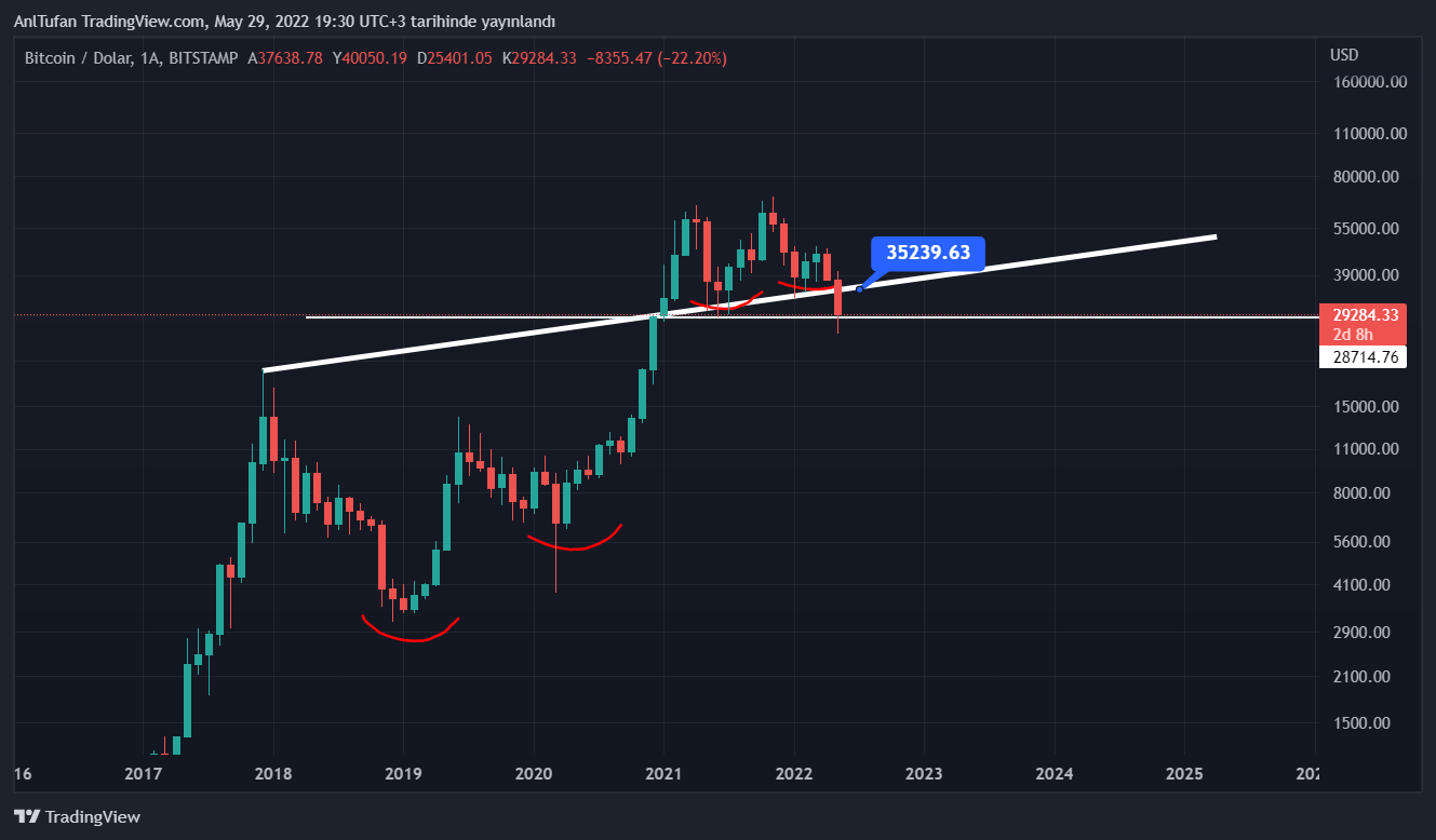 2018 yılının sonlarından bu yana aylık grafik üzerinde yükselen dipler oluşturan BTC, ilk kez bu ay itibariyle daha düşük bir dip oluşturarak ayı sezonunu tescilleyebilir.