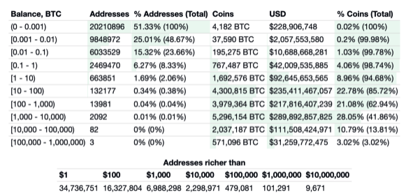 An itibarıyla 0,001 BTC tutan adreslerin sayısı 20,2 milyonun üzerinde. Bu da yaklaşık olarak 50 dolara tekabül etmekte. 2019 yılında bu özelliklere sahip cüzdanların sayısının an itibarıyla iki katına çıktığı görülüyor.