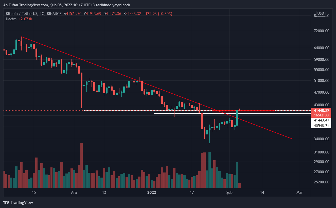 Aritmetic ve logaritmic grafiklerde bakıldığı takdir çekilebilecek 3 tane net düşen trend bulunuyordu. Bu trendlerin 3’ünü de kırmış olan Bitcoin, 40.500 – 41.500 dolar üzerinde tutunmayı başarıp 44.000 doları kırabilirse trend tam anlamıyla dönmüş diyebiliriz.