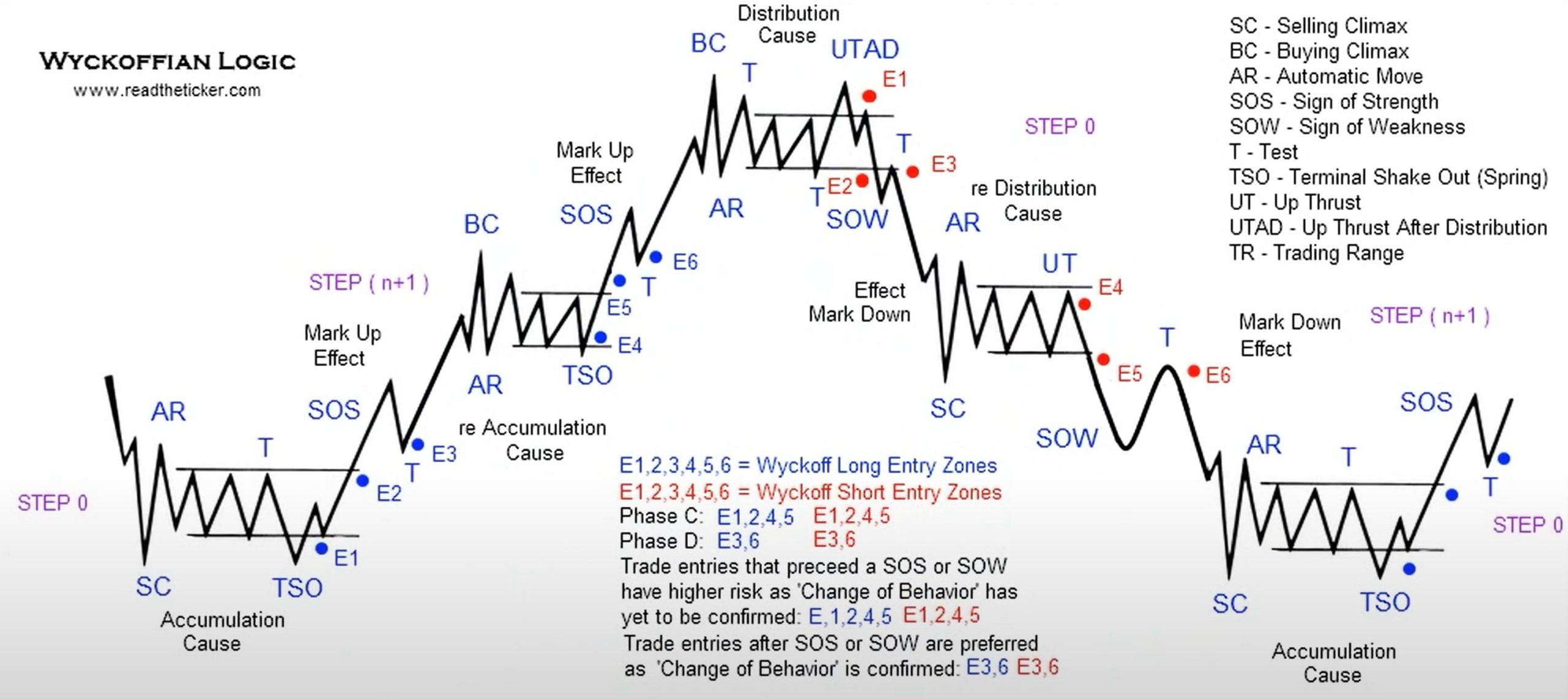 Wyckoff Logic grafiğine bakıldığı takdir de Bitcoin halen “T” olarak belirtilen test aşamasını gerçekleştiriyor olabilir. Wyckoff’un yıllar önce “piyasaların genel hareketi” olarak tanımladığı bu grafiğe göre Bitcoin’de bir düşüş daha gelebilir.
