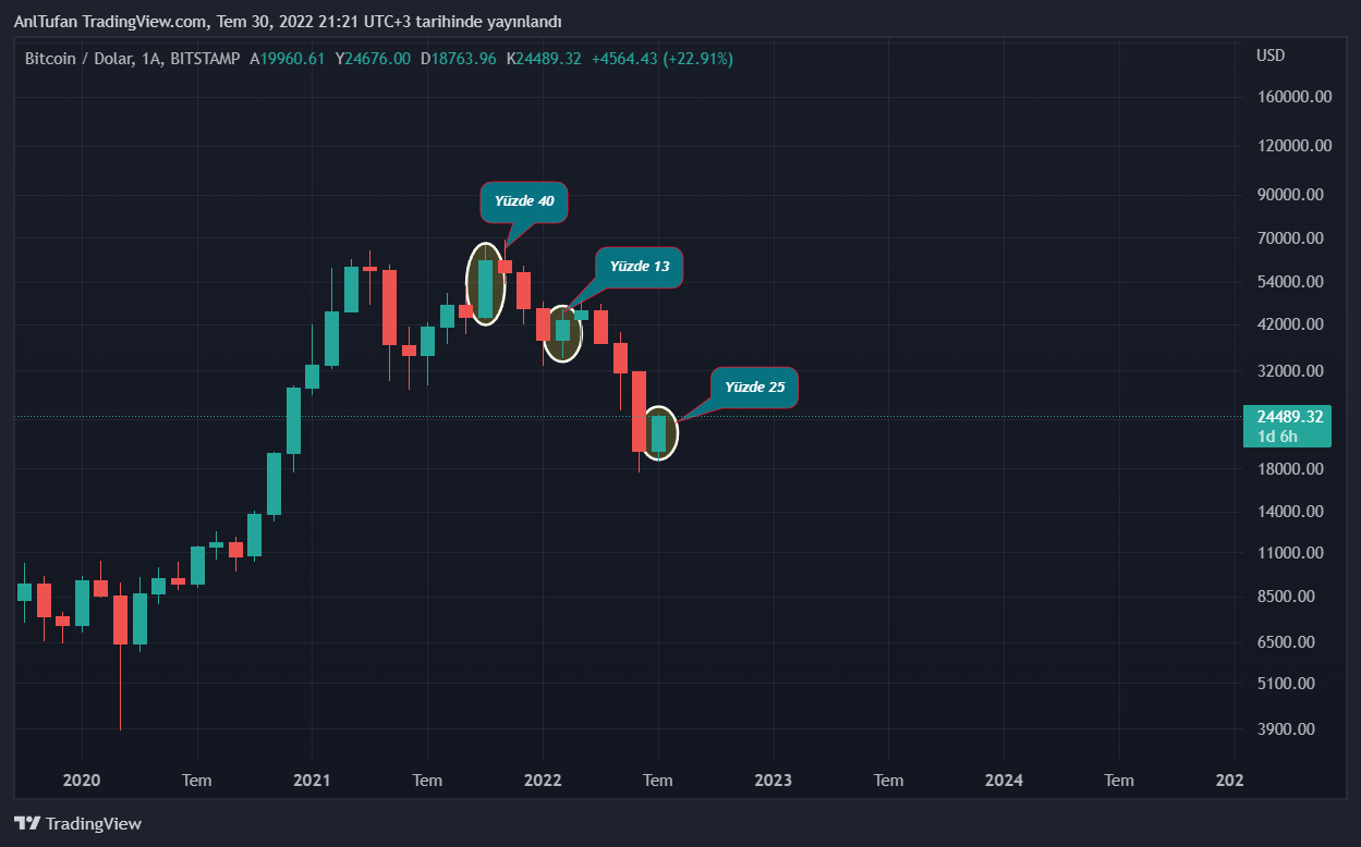 Temmuz ayı itibariyle birçok altcoin halen dip seviyesinde konumlandığı görülüyor. Yarın akşam itibariyle BTC‘nin 25 bin dolar seviyelerinde bir kapanış yapması, Ağustos ayında büyük bir altcoin rallisini başlatabilir.