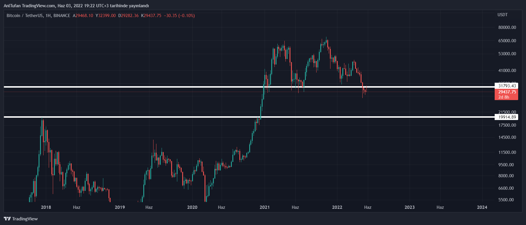 BTC‘de yükselişlerin başlayabilmesi için 31.800 doların yukarı yönlü kırılması gerekiyor. Bu seviyenin tekrardan kazanılmaması durumunda ise lider kripto para birimi olan Bitcoin‘in (BTC) ilerleyen süreçte 20.000 dolar seviyelerine kadar düşüş yaşadığını görebilir.