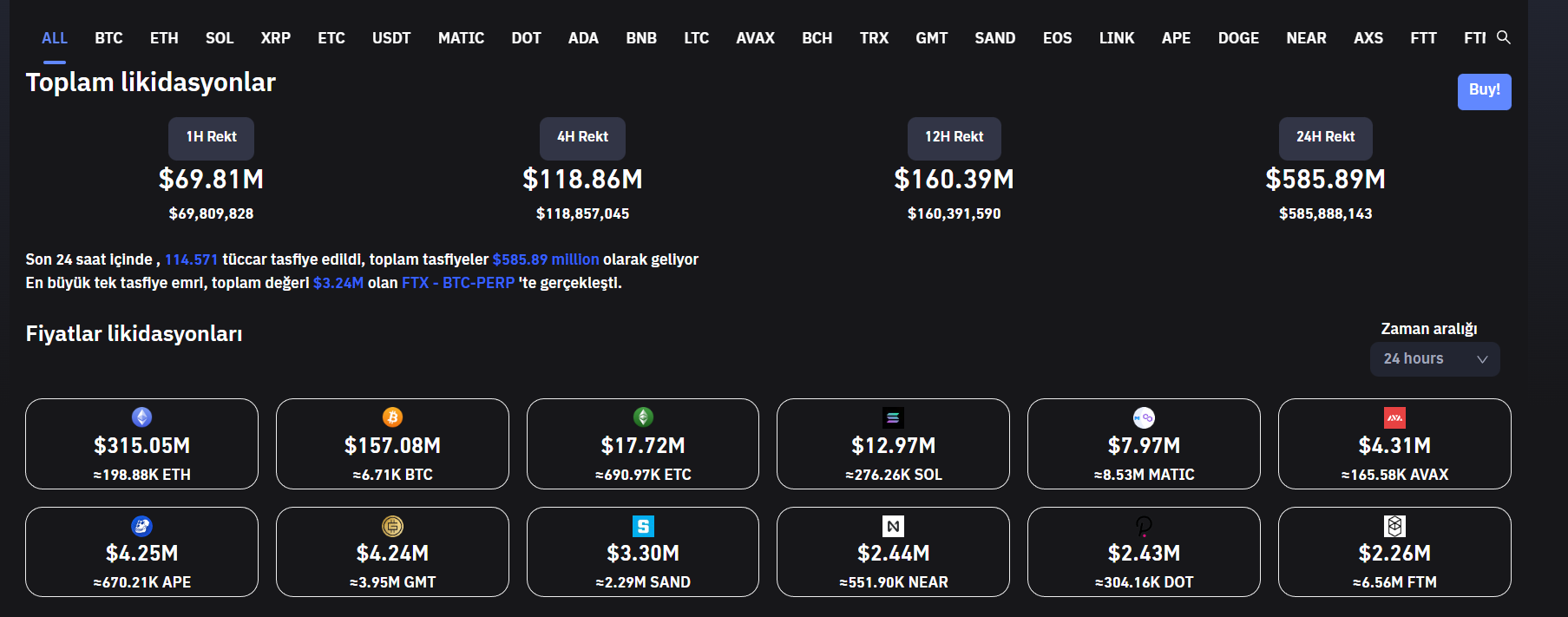 315 milyon dolarlık Ethereum pozisyonu likit edilirken, ardından sırasıyla 157 milyon dolarlık pozisyon ile Bitcoin gelmekte.