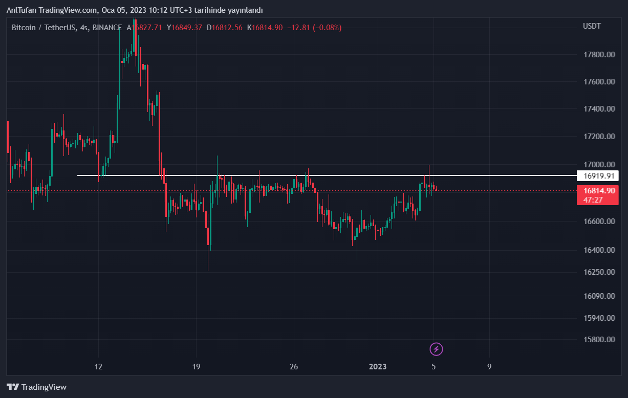 Bitcoin’de yükselişleri hızlandıracak seviyenin 16.919 dolar direnci olduğu görülüyor. BTC’nin ilerleyen saatlerde bu direnç seviyesi üzerinde 4 saatlik bir kapanış yapması halinde kripto varlıklar sert yükselişler yaşayabilir.
