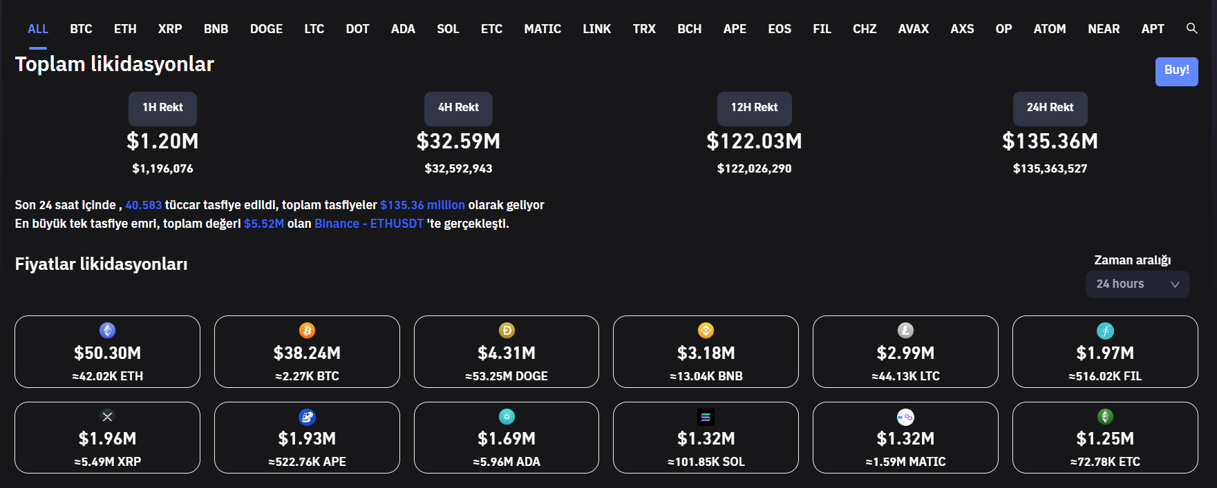 Bu yaşanan düşüşlerdeki likidasyonlara baktığımızda ise son 24 saat içerisinde toplamda sadece 135 milyon dolarlık bir likidasyonun gerçekleştiği görülüyor.
