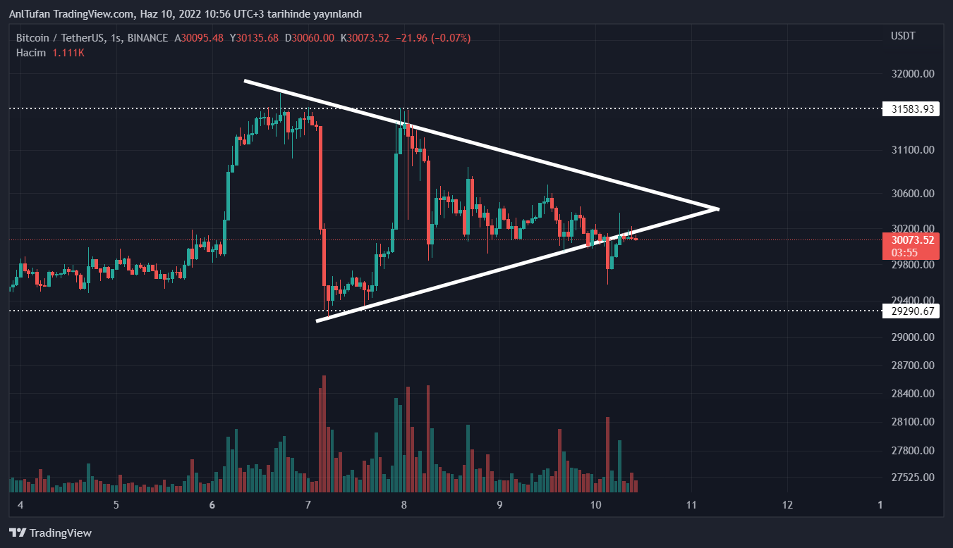 Simetrik üçgenin aşağı yönlü kırılması Bitcoin ve kripto paralar için hiç iyi bir haber olarak görülmüyor. İlerleyen saatlerde tekrardan 30.200 doların üzerine çıkması gereken BTC, anca bu şekilde satıcı baskısını bir nebzede olsa kırabilir.