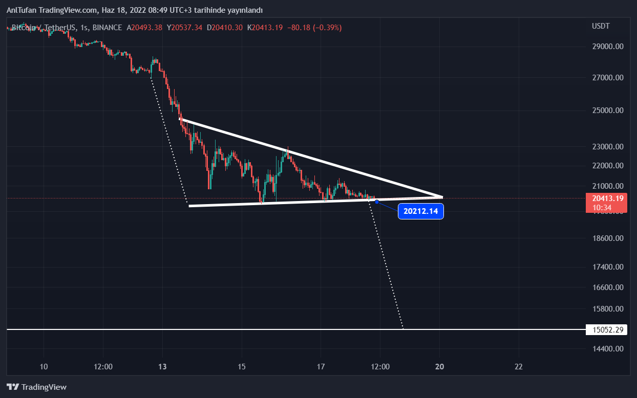 Bu ayı bayrağına göre ilerleyen saatlerde lider kripto para birimi 20.200 dolar destek seviyesinin altına sarkmasının ardından 15 bin dolar destek seviyesine kadar büyük bir düşüş daha yaşayabilir.