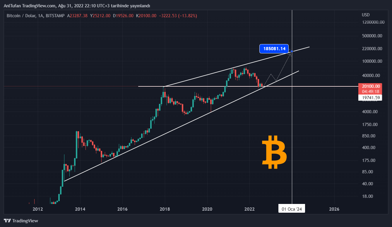 Bitcoin, 2023 – 2024 yılları arasında yaşanacak olan olası boğa sezonunda, aylık grafik üzerinde gösterdiğimiz üst trend bölgesine kadar değer kazanabilir.