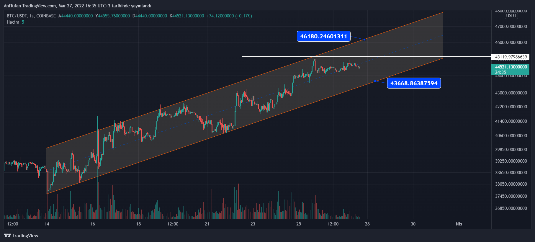 İlerleyen saatlerde tam tersi senaryonun gerçekleşmesi durumunda ise Bitcoin’in yine 45.500 – 46.500 dolar direnç bölgesini aşması gerekiyor.