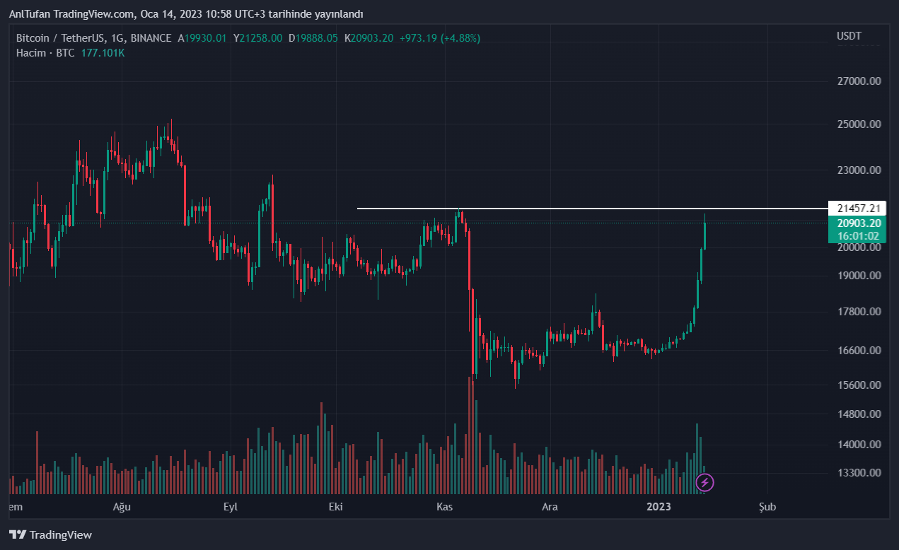 Lider kripto para birimi Bitcoin’in ilerleyen süreçte yükseliş trendini hızlandırması için 21.400 dolar direnç seviyesini aşması gerekmekte. FTX borsasının iflasının ardından bu seviyeden büyük bir çöküş yaşayan BTC, yine her şeye rağmen toparlanmayı başardı.