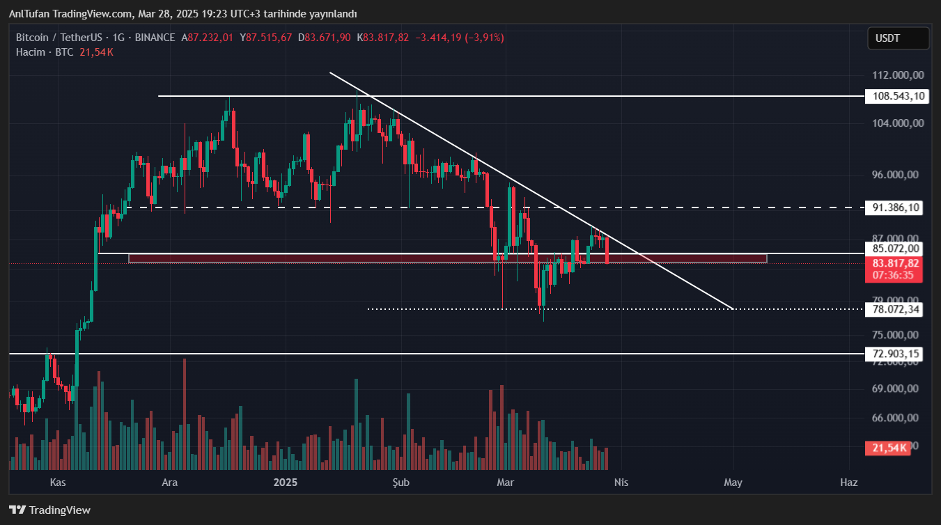 Önümüzdeki saatlerde lider kripto para birimi Bitcoin’in (BTC) 84 bin – 85 bin dolar desteğini kaybetmesi, BTC’nin 78 bin dolara kadar ani düşüşler yaşamasına sebebiyet verebilir.