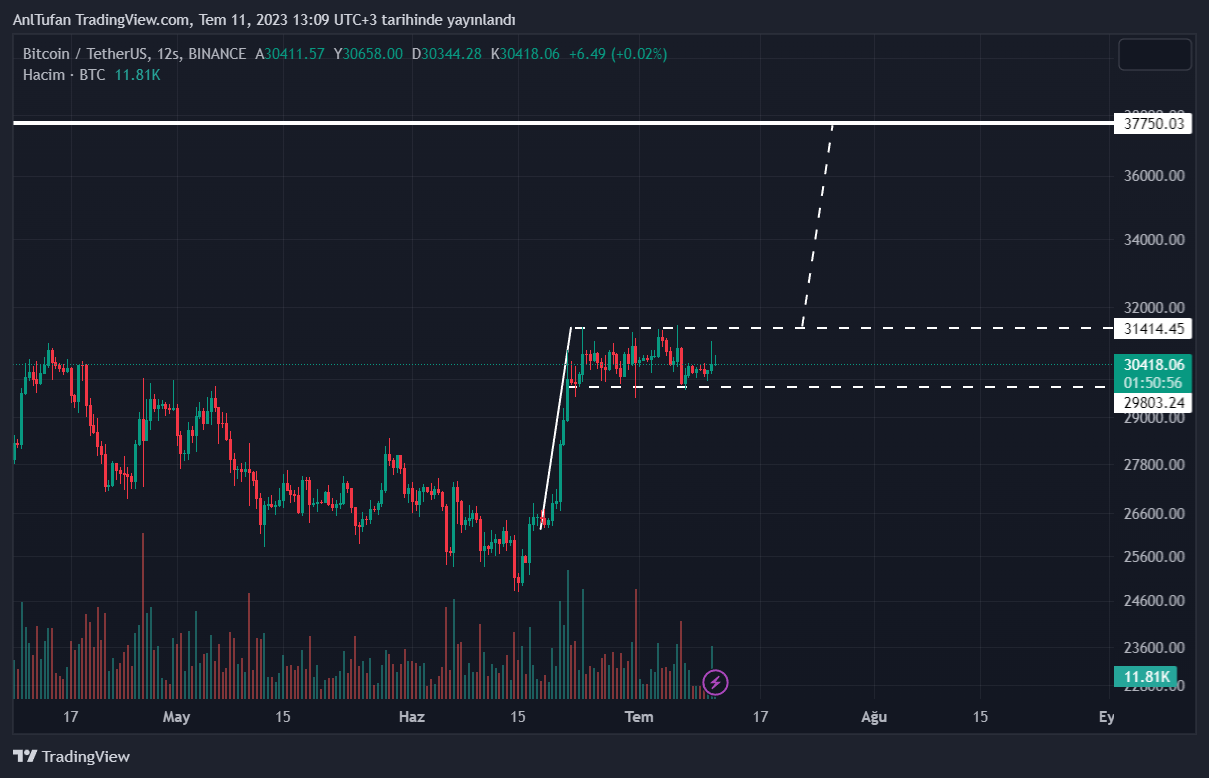 Boğa bayrağı formasyonuna göre bayrak direği kadar bir yükseliş yaşaması beklenen BTC, 31.500 doları aşması halinde 37 bin dolar seviyelerini hedefleyebilir.