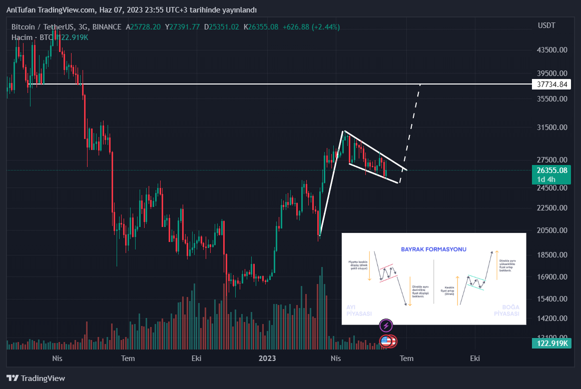 İlerleyen süreçte 3 günlük grafik üzerindeki boğa bayrağı formasyonunu yukarı yönlü kırabilecek olan BTC, bayrak direği kadar bir yükseliş yaşayacaktır.