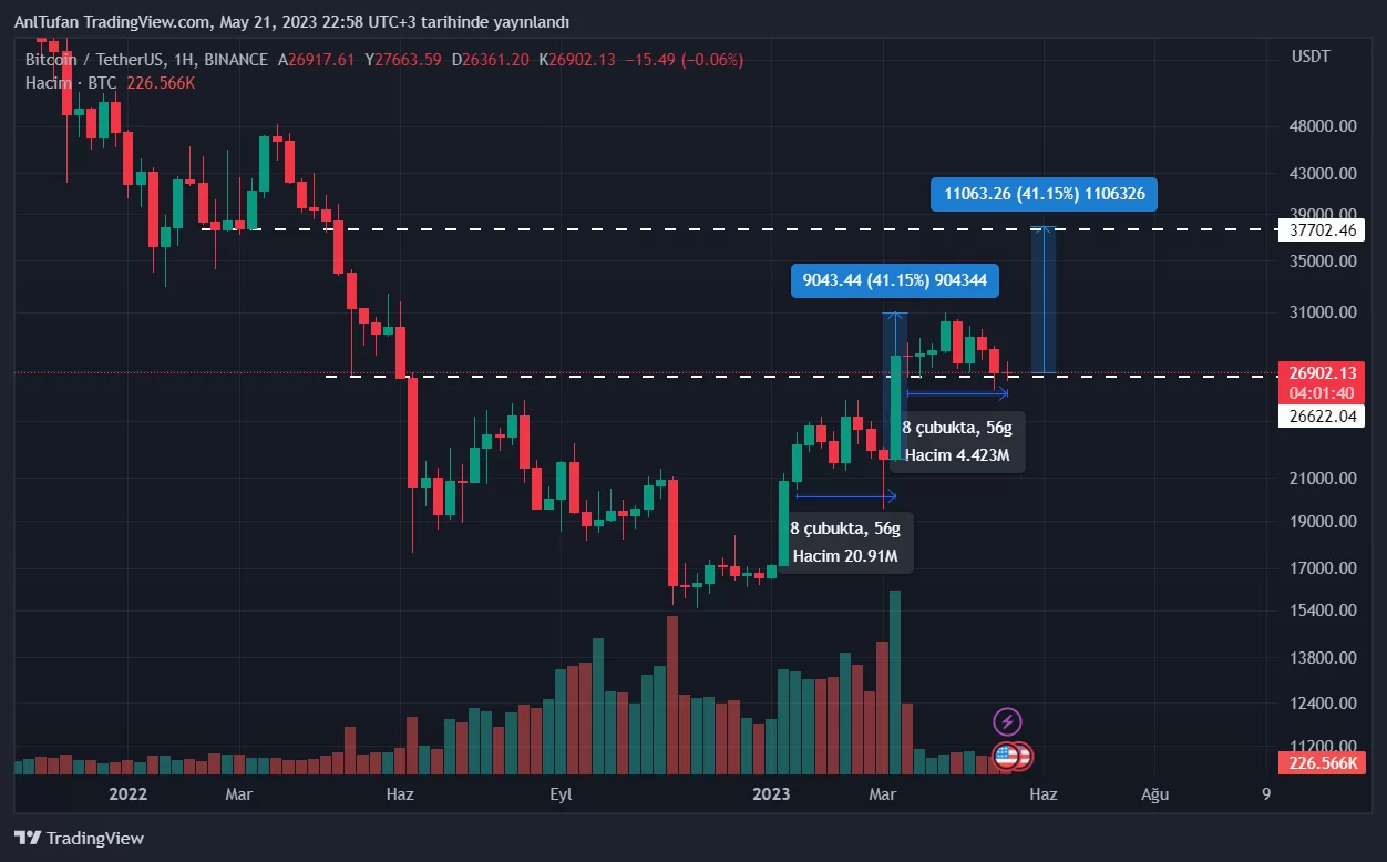 İlerleyen günlerde Bitcoin’de tarihin tekerrür etmesi ve BTC’nin 26.500 – 30.500 dolar aralığından çıkmayı başarması halinde, yine yüzde 41.15’lik bir yükseliş yaşanabilir.