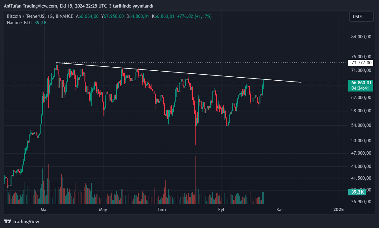 Düşen trendin kırılımı sonrasında bir süre 68 bin – 73.777 dolar aralığında akümüle olması beklenen BTC, ATH’ı da aşması halinde çok beklenen mega ralliyi başlatabilir.