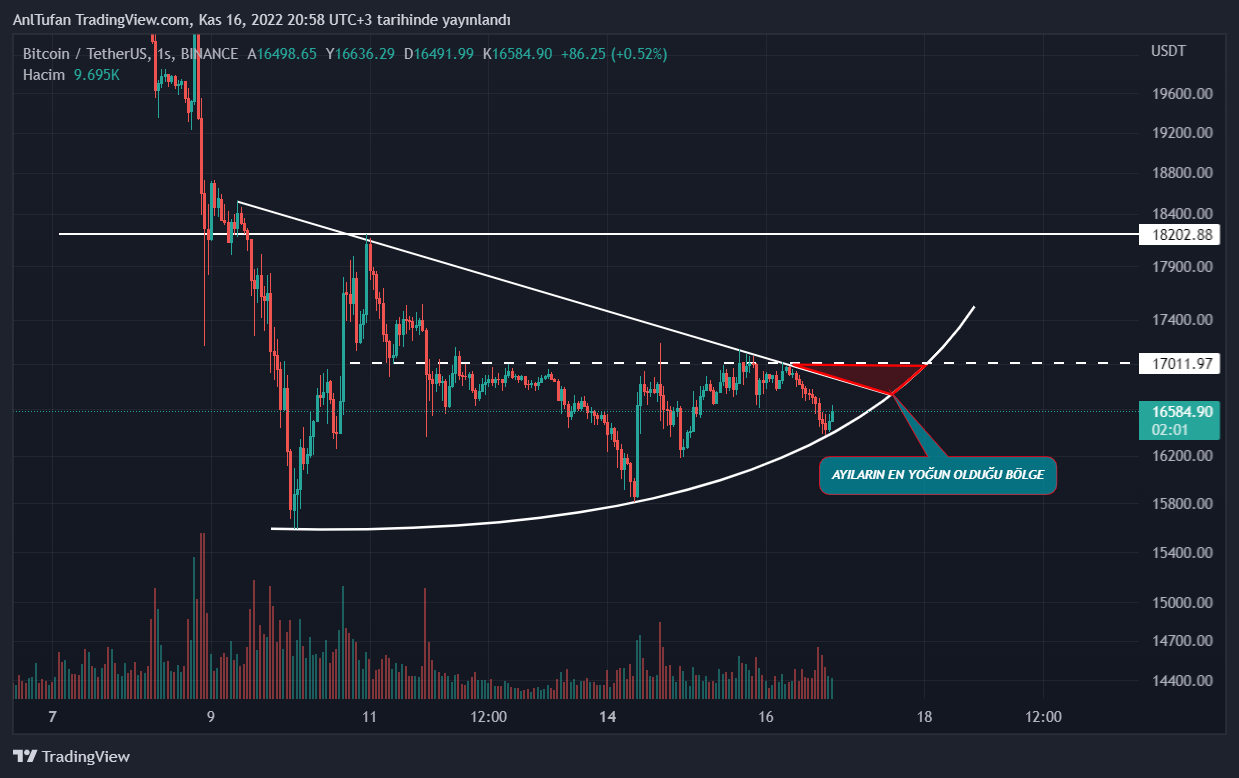 Düşen trend noktası olan 16.800 dolar ile yatay direnç noktası olan 17 bin doların arasındaki 200 dolarlık bölge, Bitcoin’de ayıların en yoğun olduğu yer olabilir.