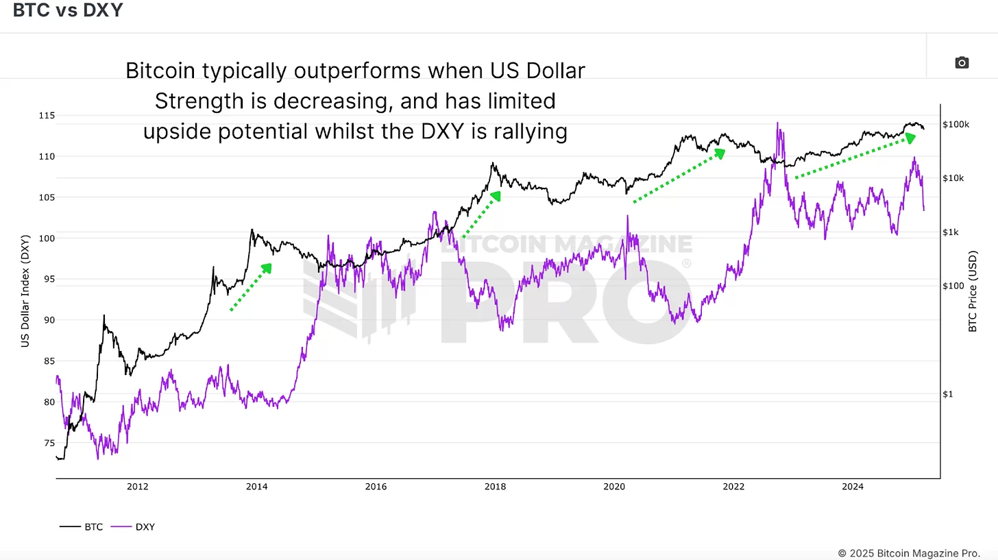Lider kripto para birimi Bitcoin‘in (BTC) fiyat hareketleri uzun zamandır ABD Dolar Endeksi (DXY) ile ters orantılıdır. Tarihsel olarak DXY güçlendiğinde, BTC düşüşe geçer. Buna karşın DXY’nin düşüşleri genellikle Bitcoin fiyatının değer kazanması için olumlu makroekonomik koşullar yaratır.