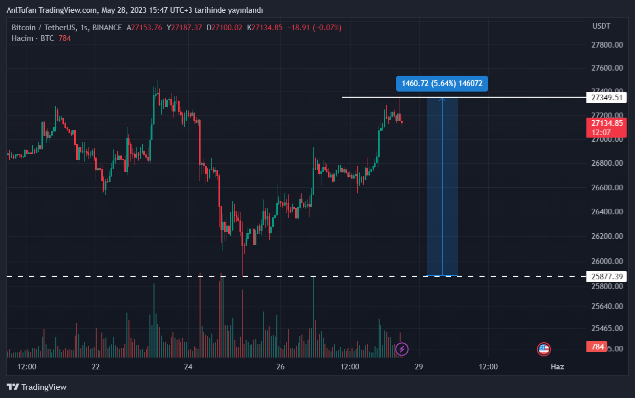 Bitcoin bu krizin çözülmesiyle birlikte ise son dip seviyesi olan 25.877 dolar seviyelerinden yüzde 6’ya yakın bir yükseliş yaşayarak 27.350 dolara kadar bir yükseliş yaşamış durumda.