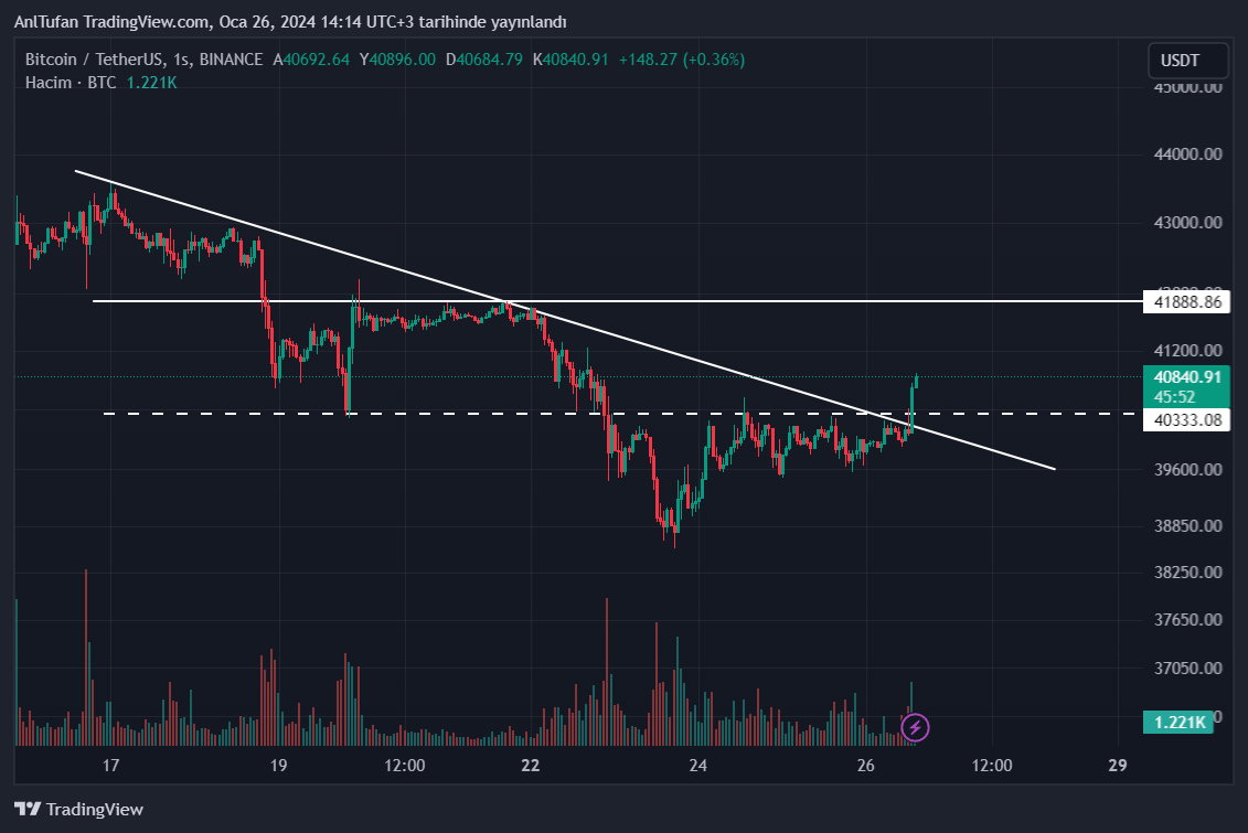 Bitcoin’de minor düşen trend ve major yatay direnç 40.300 dolar seviyelerinde kesişiyordu. BTC’nin son dakikalarda bu kesişim noktasını yukarı yönlü kırdığı görüldü.