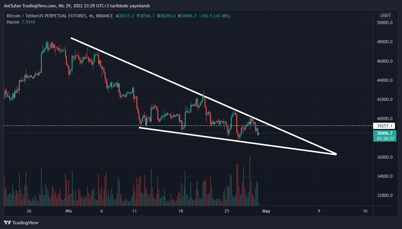 Üzerinde halen yoğun bir satış baskısı bulunan Bitcoin, 4 saatlik grafik üzerinde bir bullish patern olan düşen takoz formasyonu oluşturmuş durumda.