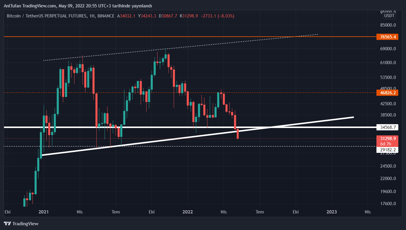 Haftalık kapanış için daha 6 gün bulunsa da, yükselen trend ve yatak destek bölgesi olan 33.000 – 34.500 doların altında 4 saatlik ve günlük kapanışların gerçekleşmesi, kripto piyasasını çok daha büyük bir buhrana sürükleyebilir.