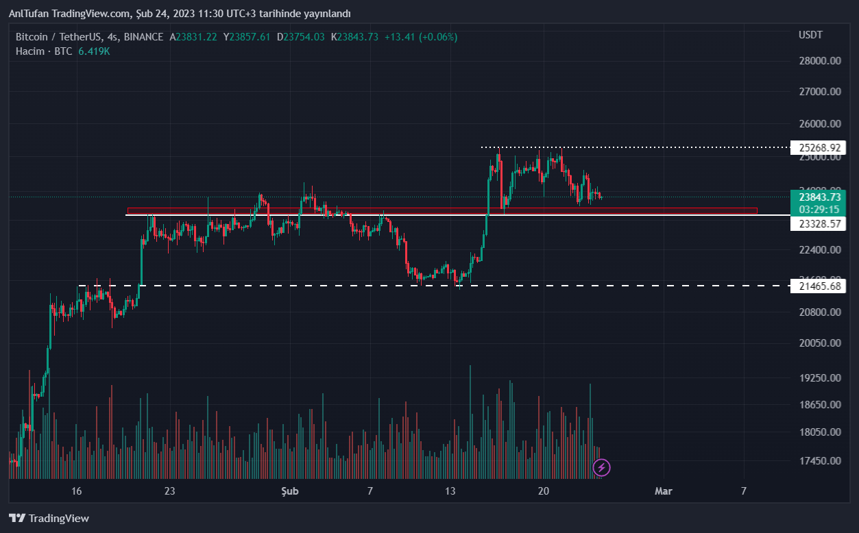 Lider kripto para birimi Bitcoin (BTC) 21 Şubat tarihinden beri değer kaybetmeye devam ediyor. 25.250 dolar direncini aşmayı başaramayan BTC, bu direnç seviyesinden yüzde 6 oranında değer kaybederek 23.800 dolar seviyelerine gerilemiş durumda.