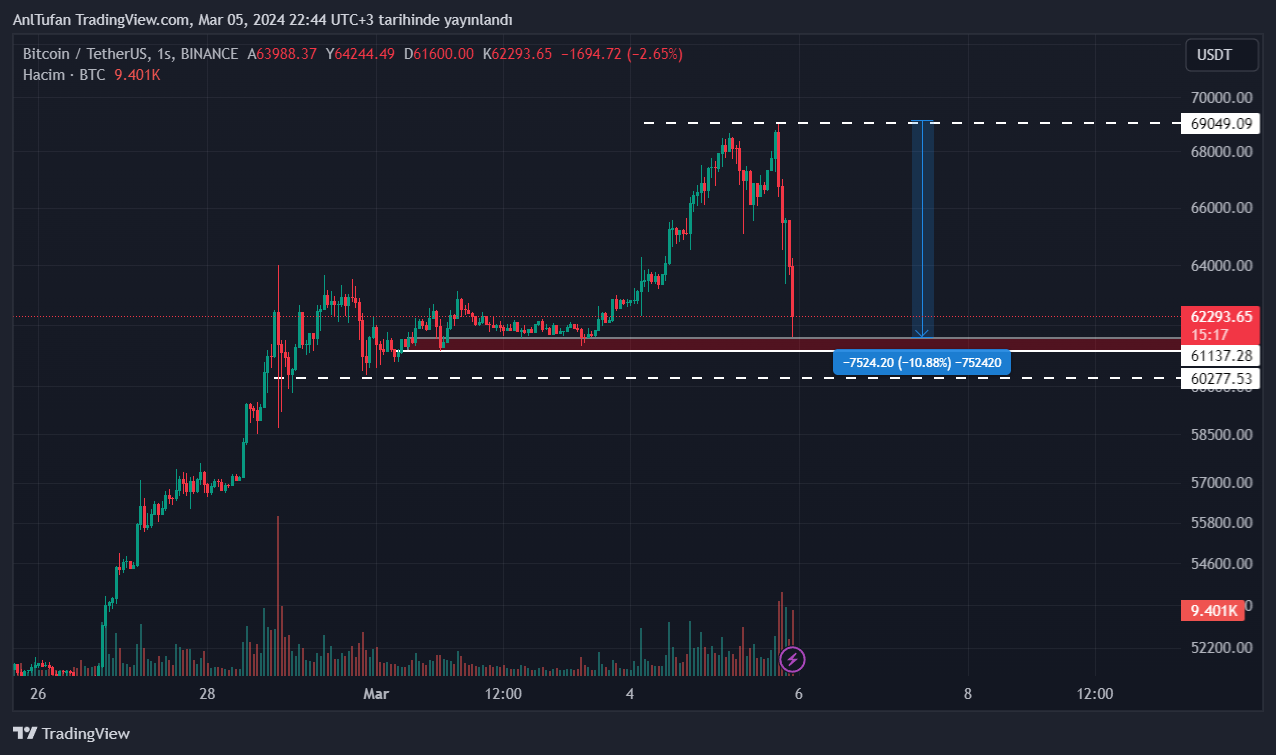 Bitcoin’de bu destek bölgesinden yeniden yukarı yönlü hareketlerin başlaması halinde ise 69 bin dolar ATH seviyesi takip edilmeli. BTC’nin bu ATH’ı aşana kadar dönem dönem bu tarz sert satış baskıları ile karşılaşmaya devam edeceği tahmin ediliyor.