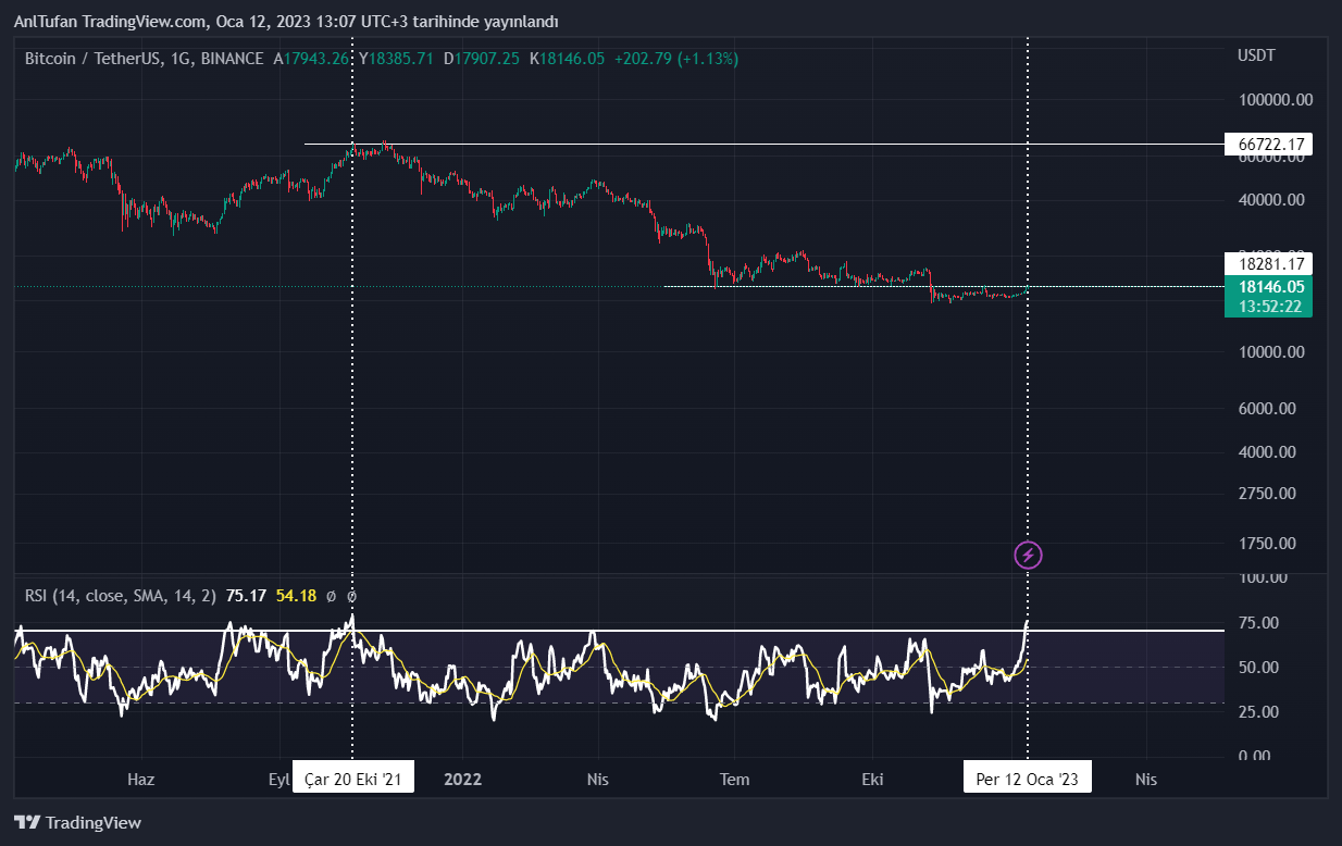 Lider kripto para biriminin en son 20 Ekim 2021 tarihinde günlük grafikteki RSI üzerindeki aşırı alım bölgesine ulaştığı görülebiliyor. 66.700 dolar seviyelerinde aşırı alıma giren BTC, o günden sonraki aylarda devasa çöküşler yaşadı.
