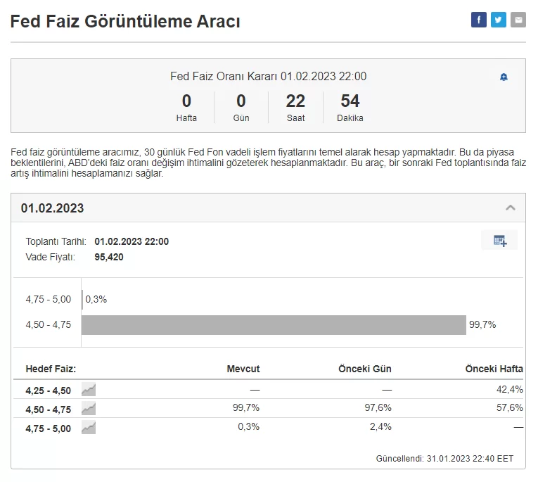 TSİ 22.00’da açıklanacak olan faiz kararındaki son duruma baktığımızda, 25 baz puanlık artışın ezici bir üstünlüğü bulunmakta. Piyasalar an itibariyle yüzde 99.7 oranında FED’in 25 baz puanlık bir artış yapmasını bekliyor.