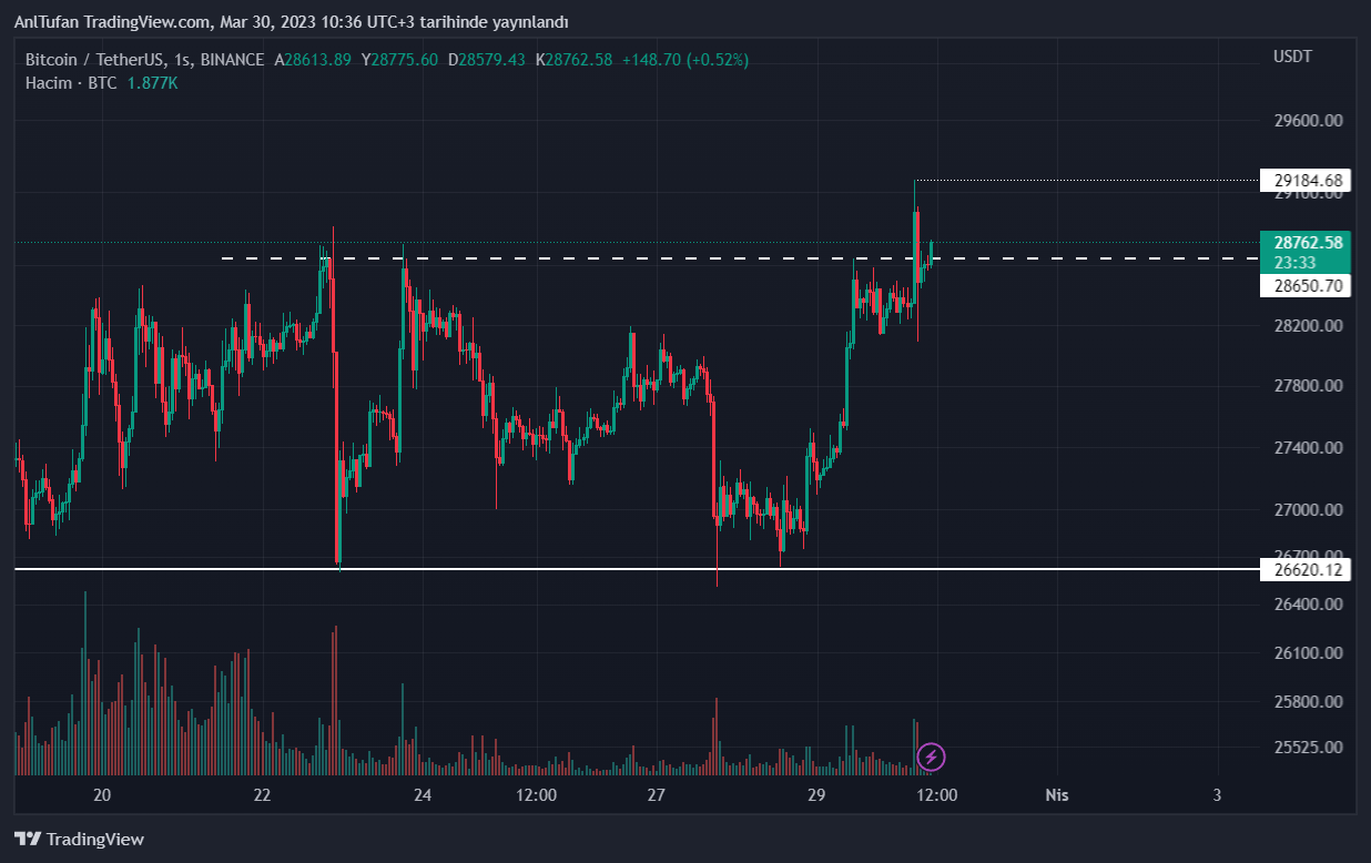 Dün gece itibariyle ise Bitcoin’de bir gece operasyonu düzenlendi. TSİ 05.00 sularında 28.650 dolar direncini aşmayı başaran BTC, volatil bir şekilde yükseliş yaşadı.