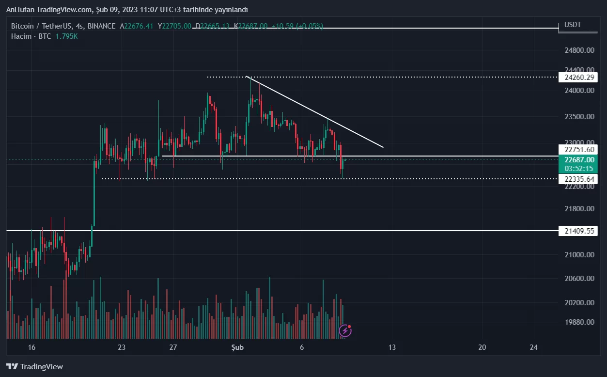 Bitcoin’in bu destek seviyesini kırmasının ardından sonra ise bu akümülasyon bölgesinin son noktası olan 22.335 dolara kadar gerilediği görüldü. Her ne kadar BTC 22.335 dolar seviyelerinden tepki alsa da, halen 22.750 dolar geri kazanılamamış durumda.