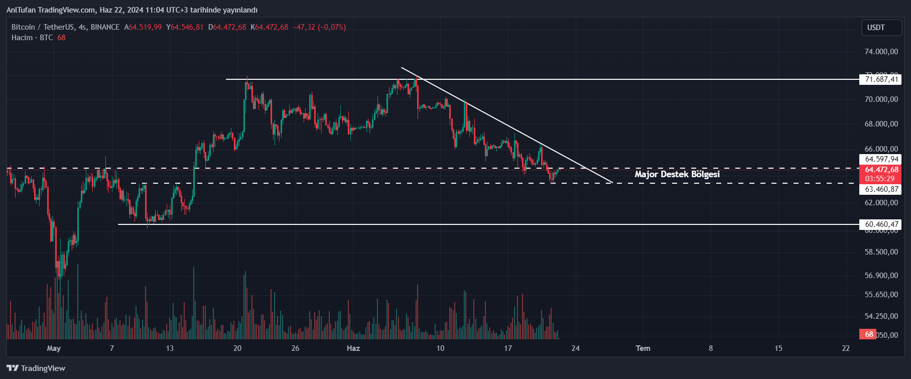 Bitcoin’in düşen trendinden reddedilmesi ve 64.500 – 63.500 dolar desteğinin altına sarkması ise BTC’nin 60.500 dolara kadar düşmesine sebebiyet verebilir.