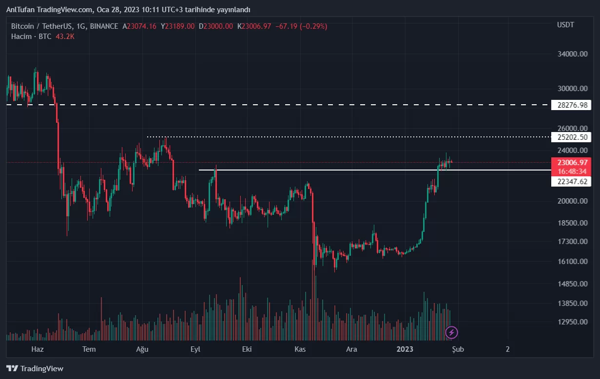 Bu hafta sonu itibariyle de tekrardan 25 bin dolar seviyelerini hedefleme ihtimali bulunan Bitcoin, 22.300 dolar major desteğini kaybetmesi halinde ise sert düşüşler yaşayarak sektörde kaos oluşmasına neden olabilir.