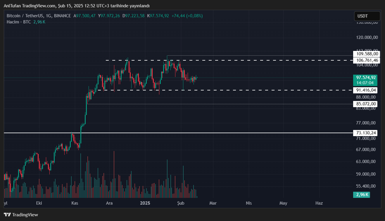 Lider kripto para birimi Bitcoin (BTC) haberimizin yazıldığı esnada 97.500 dolar seviyelerinden işlem görüyor. BTC uzun bir süredir 91.400 – 106.750 dolar aralığında konumlanmakta.