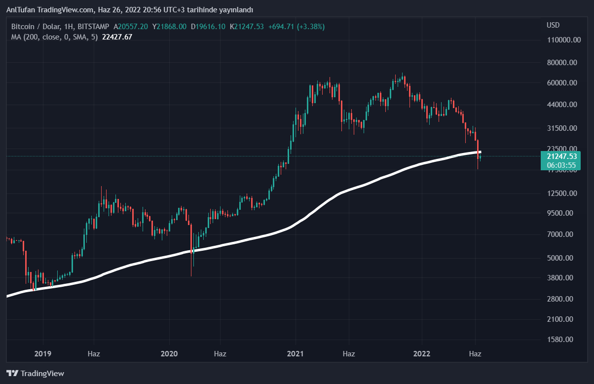 Şuan itibariyle 200 haftalık hareketli ortalamanın altında işlem gören lider kripto para birimi, tarihi boyunca hiçbir zaman bu ortalamanın altında tam bir haftalık mum kapatmadı.