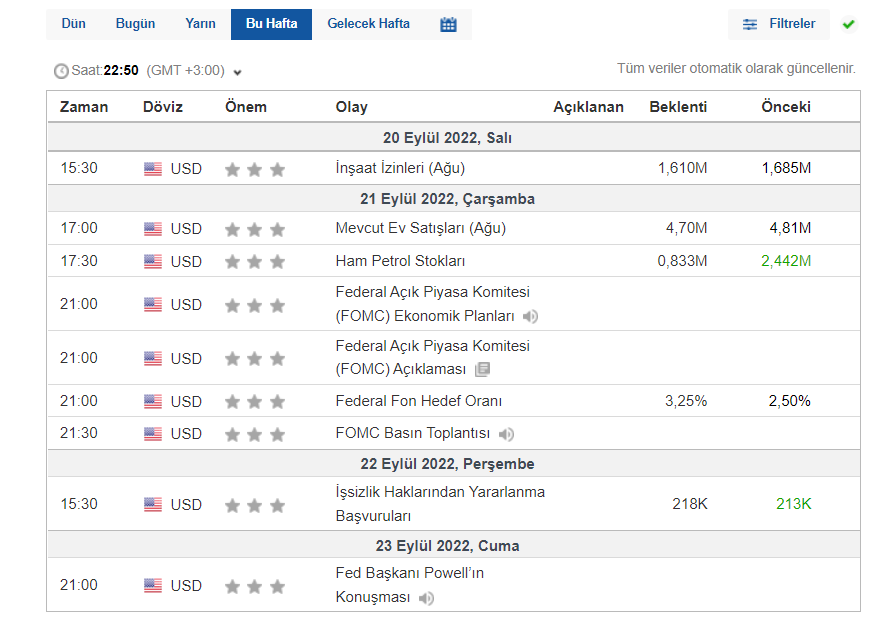 21 Eylül tarihinde FED başkanı Powell konuşma yapacağı gibi 23 Eylül tarihinde de tekrardan kameralar karşısına geçeceği görülüyor. 2 konuşmada da benzer söylemlerde bulunması beklenen Powell, piyasalarda hareketli saatlerin yaşanmasına neden olabilir.