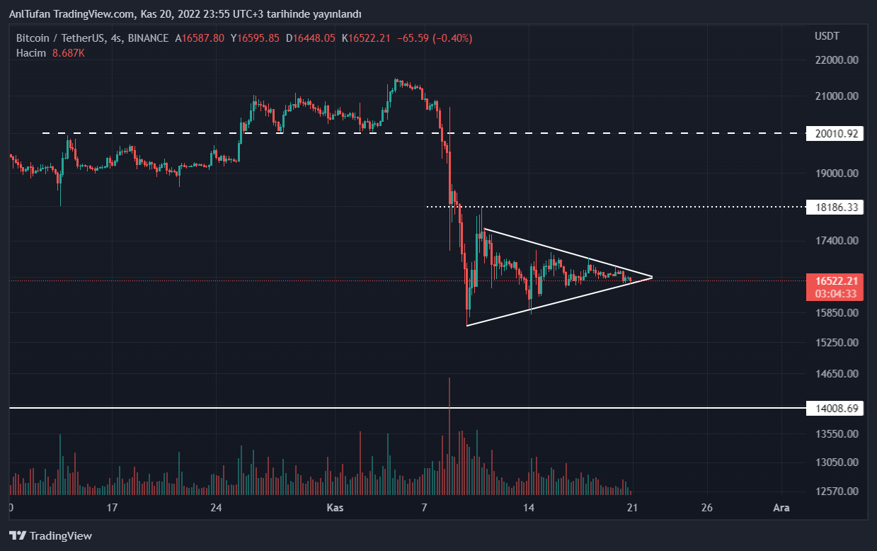Bitcoin’in önümüzdeki hafta itibariyle simetrik üçgen formasyonunun üst trend bölgesini aşması, kısa bir süre içerisinde 18.200 dolara kadar yükselmesini sağlayacaktır. Çok uzun bir süre bu seviyenin üzerinde kalmayı başaran BTC, FTX‘in iflas etmesi ile birlikte kritik noktayı kaybetmişti.