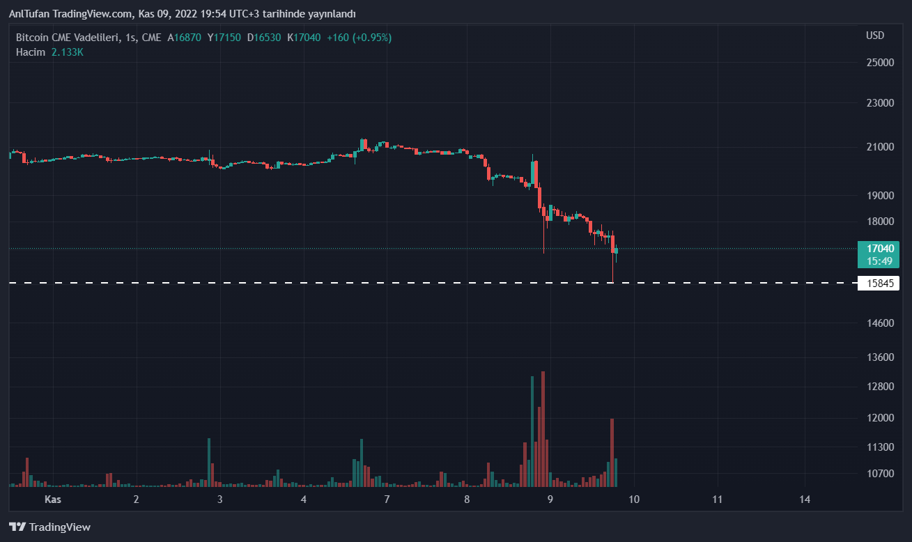 Her ne kadar borsalar üzerinde Bitcoin, USDT paritesinde en fazla 16.797 dolar seviyelerine kadar gerilemiş olsa da, Bitcoin CME vadelilerinde 15.850 dolar kadar geriledi.
