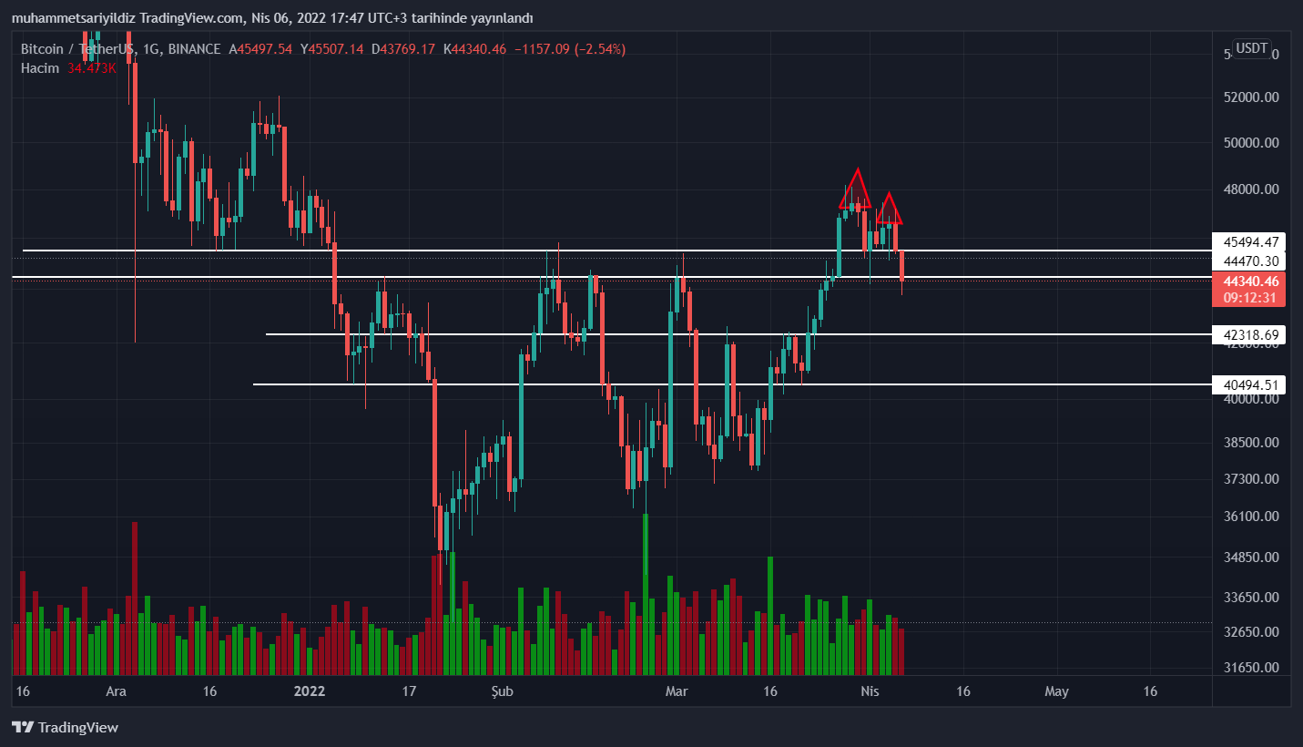 Haberimizin yazıldığı esnada 44.250 dolar seviyelerinde bulunan BTC, ilerleyen saatlerde yukarı yönlü bir sıçrama yaparak 44.500 dolar üzerinde kapanışlar yaptığı takdirde daha olumlu gözükecek.
