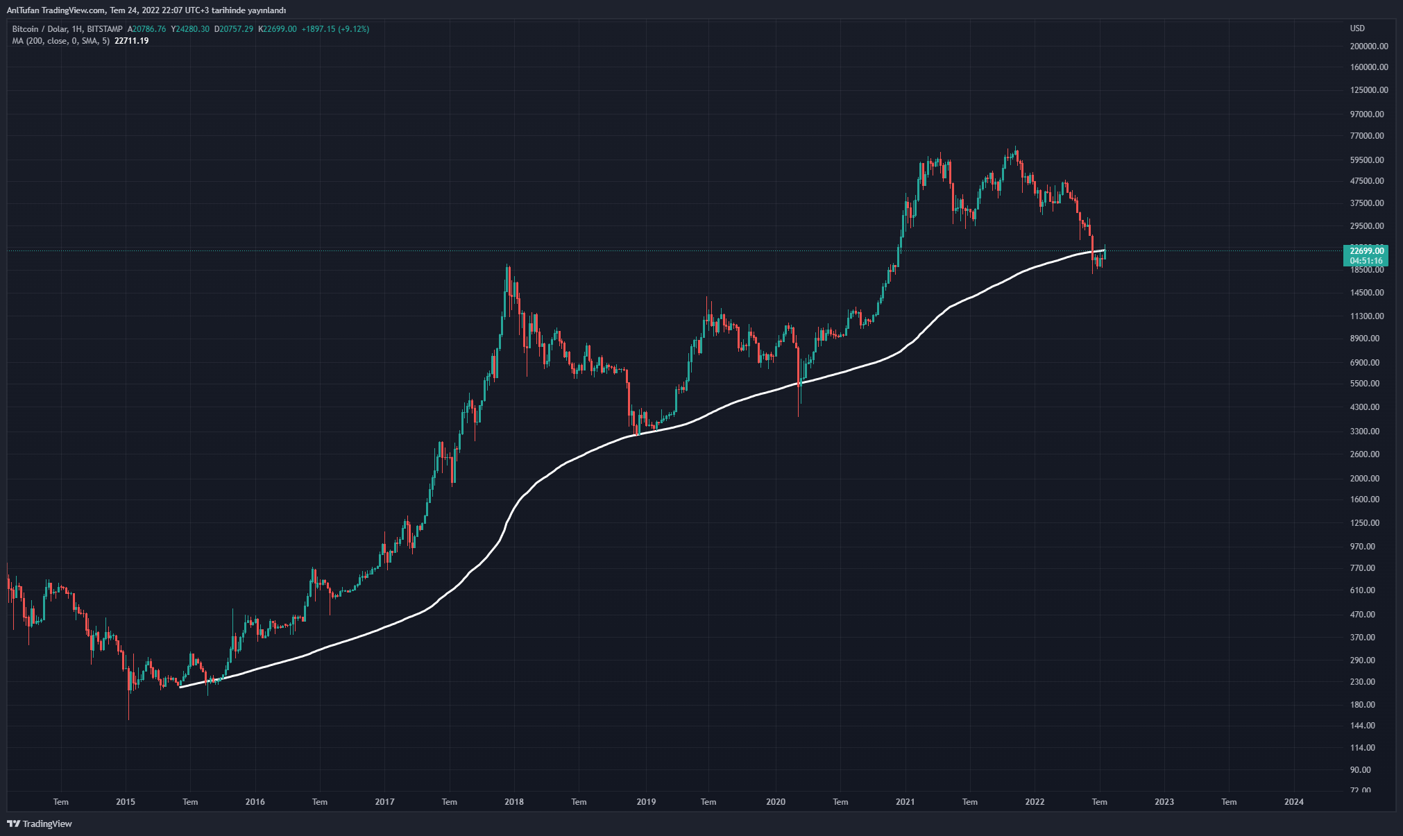Haberimizin yazıldığı esnada 22.700 dolar seviyelerinde bulunan BTC, tam 200 haftalık hareketli ortalama çizgisinden işlem görüyor.