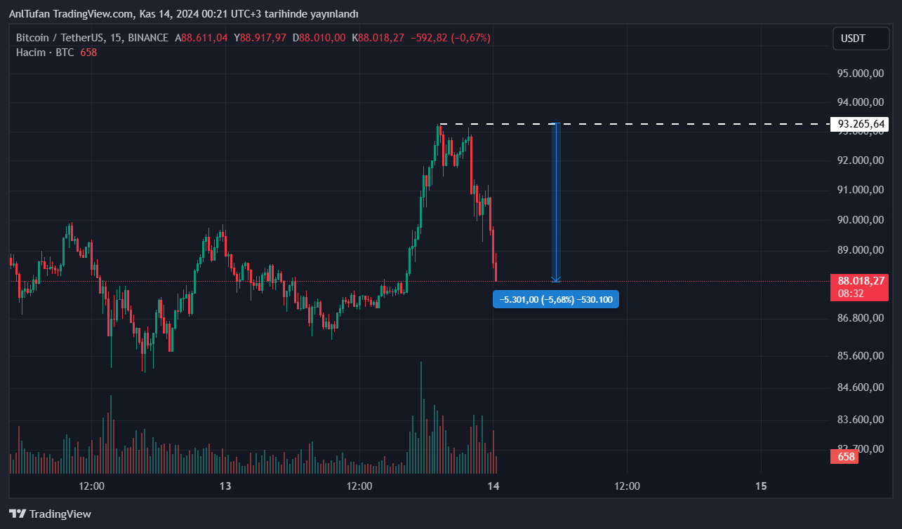 Lider kripto para birimi Bitcoin (BTC) bugün itibariyle volatil hareketler sergiliyor. BTC TSİ 19.15 itibariyle zirve tazeleyerek 93.265 dolar seviyelerine kadar yükselmiş olsa da, sürecin ilerlemesiyle birlikte bugün yaşadığı tüm yükselişleri kaybetti. BTC an itibariyle 88 bin dolardan işlem görüyor.