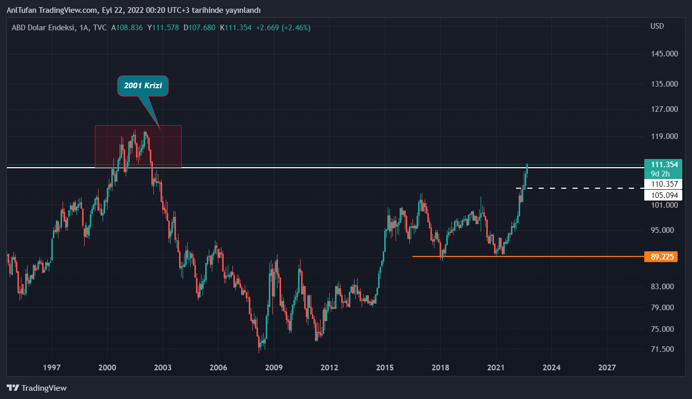 DXY en son 110 dolar seviyelerini aştığında 2001 krizi baş göstermişti. Büyük bir ekonomik çöküş yaşanmış ve altın dışında hiçbir yatırım aracı ayakta kalamamıştı.