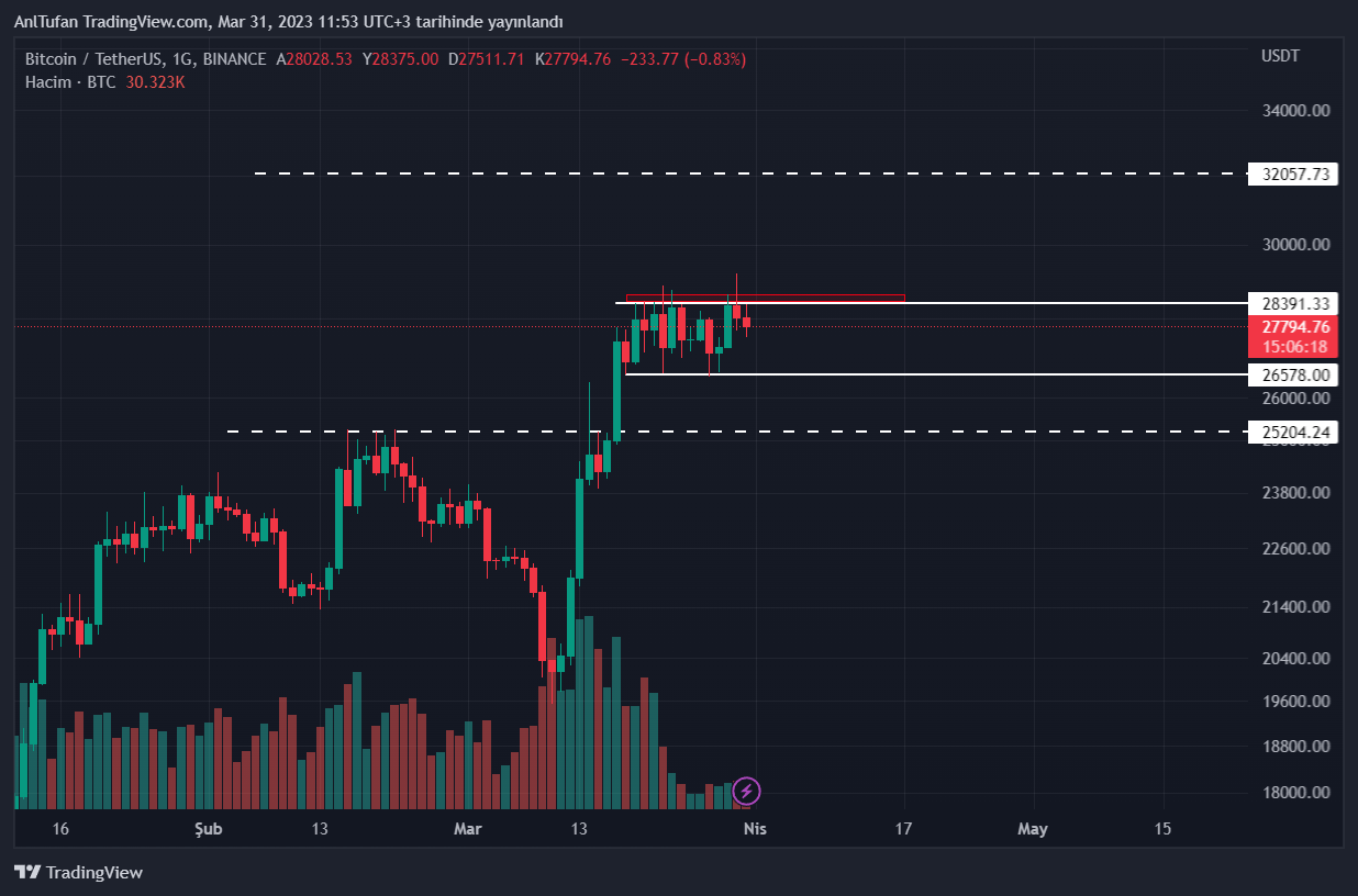 Nisan ayı özelinde lider kripto para birimi Bitcoin’in tekrardan sert bir şekilde değer kazanabilmesi için öncelikle 28.400 dolar direncini aşması gerekiyor. Bu direncin aşılması BTC’nin 32 bin dolara kadar yükselmesini sağlayacaktır.