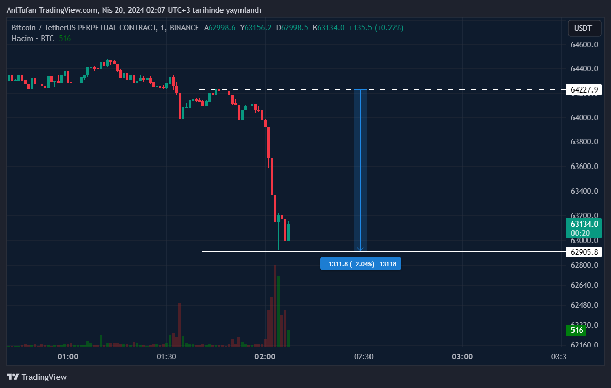 Bitcoin geçtiğimiz dakikalarda Binance vadeli piyasada 64.200 dolar seviyelerinden 62.900 dolara kadar %2’lik ani bir düşüş yaşadı.
