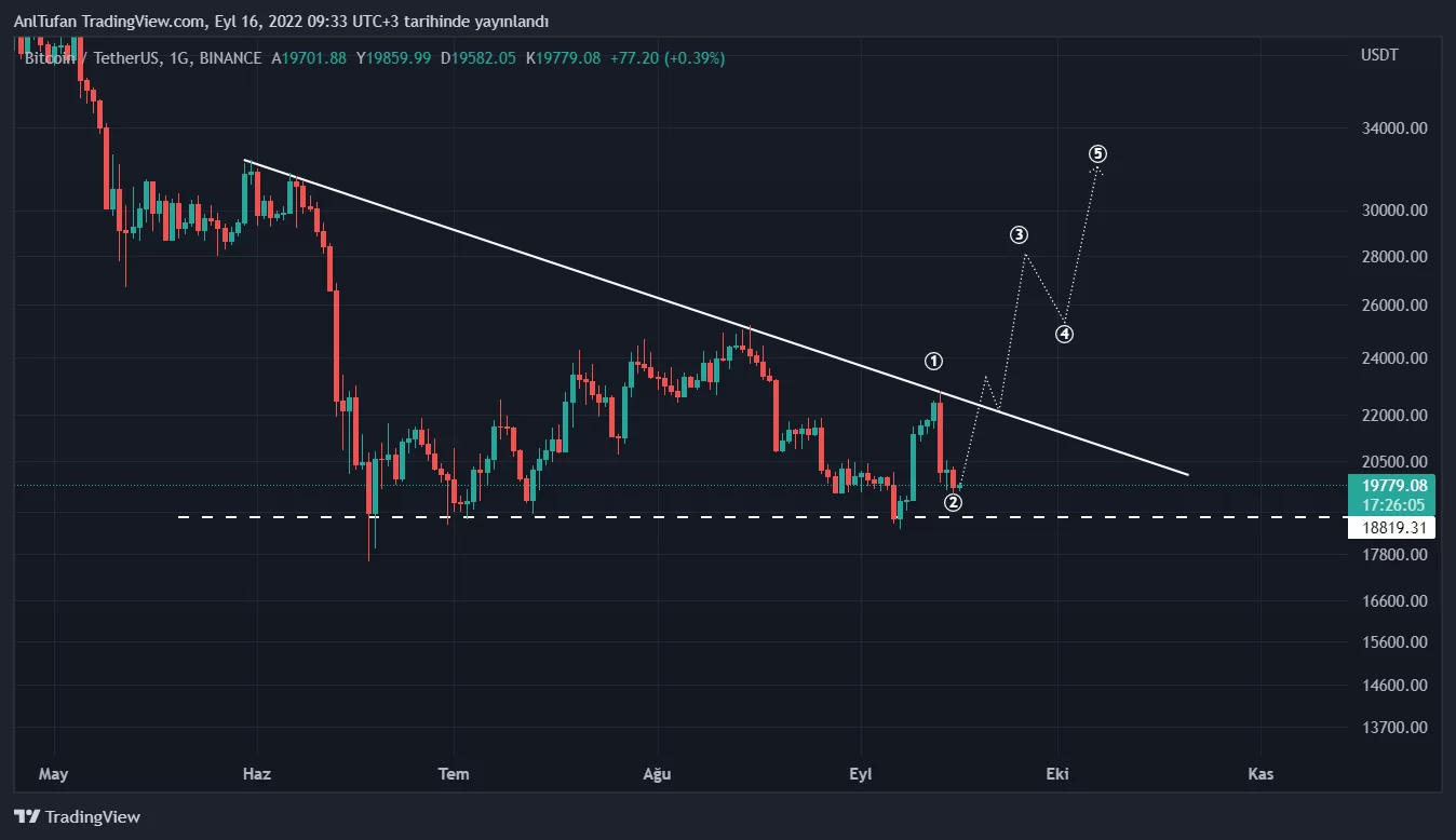 18.800 dolarda 22.700 dolara gelen yükselişte elliot’un 1. dalgasını, bu yükseliş sonrasındaki çöküşte ise 2. dalgayı tamamladığı tahmin edilen Bitcoin’in yeni hedef noktası 26 bin dolar seviyeleri olabilir.