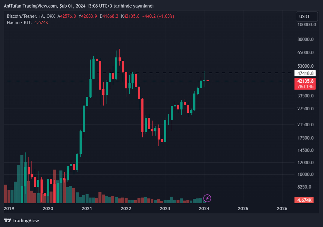 Kripto varlıkların şubat ayı başlangıcına baktığımızda, satış baskısının devam ettiği görülebiliyor. Geçtiğimiz ay aylık grafikte 47.500 dolar direnç görevi görmüştü.